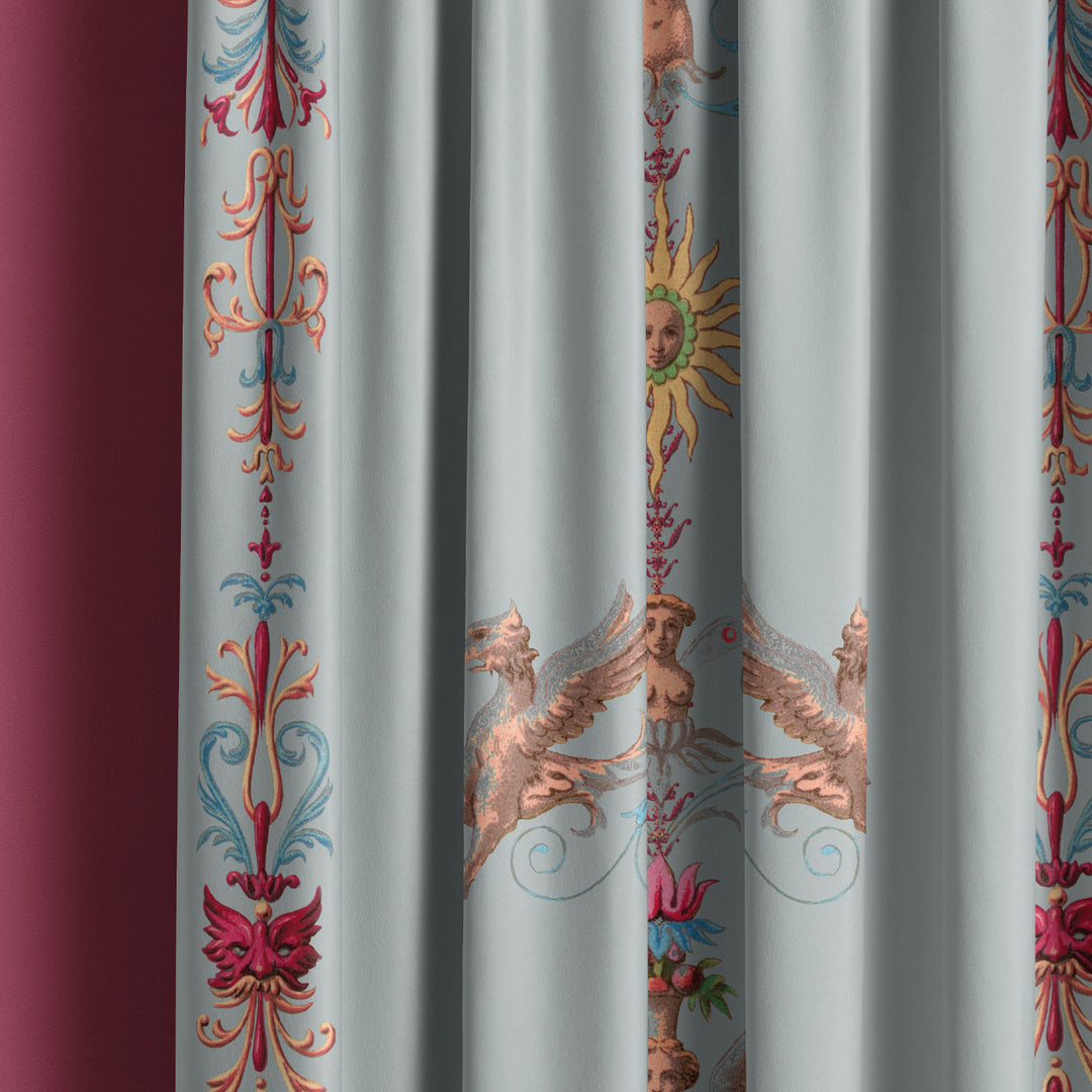 "Angels and Suns" is a versatile design that can effortlessly elevate a variety of spaces. Whether adorning flowing drapery, luxurious upholstery, or wallpaper, this enchanting pattern adds a touch of rococo charm to any interior.