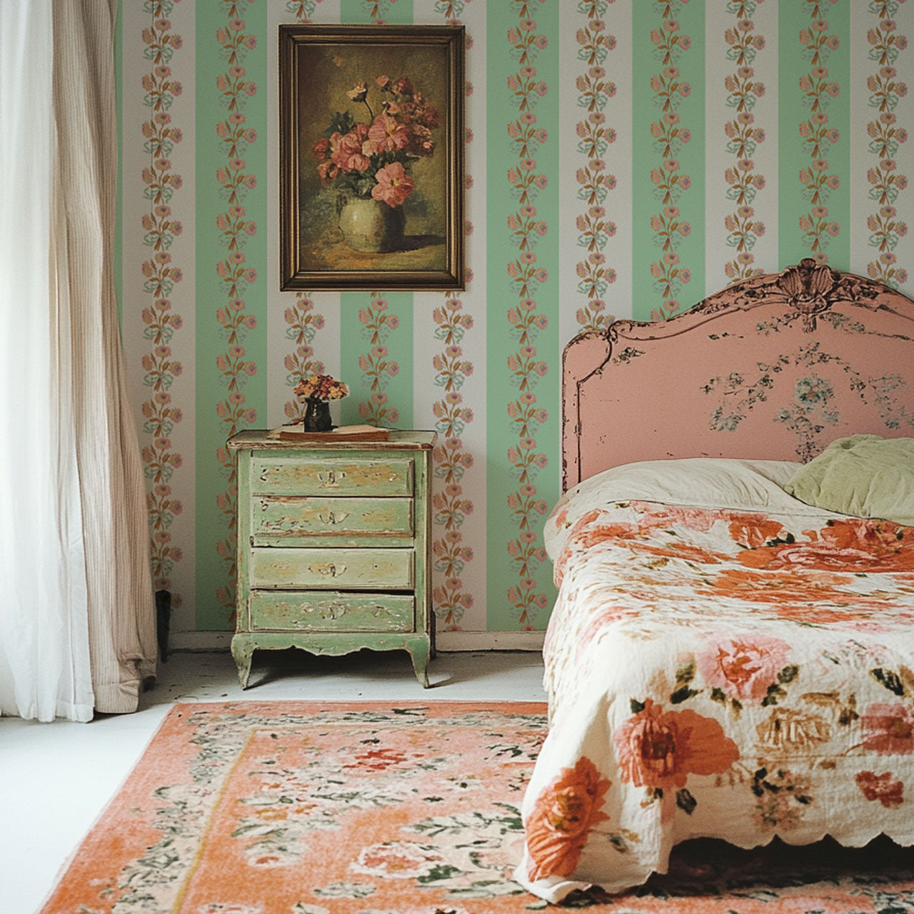 Inspired by the grandeur of French estates, "Chateau Stripe" combines ornate floral motifs and ribbon details in a classic stripe design. With its timeless elegance, this pattern bridges traditional and modern styles, offering a versatile option for both contemporary and classic interiors. The modern twist on a traditional stripe creates a refined, luxurious atmosphere, adding opulence to any space. Whether used in wallpaper or textiles, "Chateau Stripe" is perfect for those seeking to blend sophistication with charm.