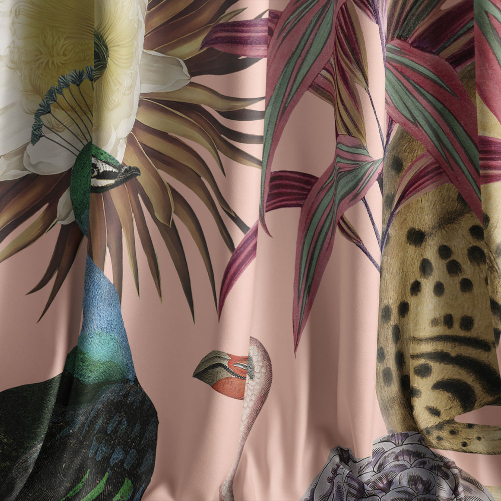 Akin to a magnificent work of art, enchanting Les Plumes depicts a gloriously tropical utopia. A large-scale, maximalist print, its menagerie of peacocks, flamingos, butterflies, and sphinx meander amongst a riot of big, bold blooms. Prepare to be entranced.