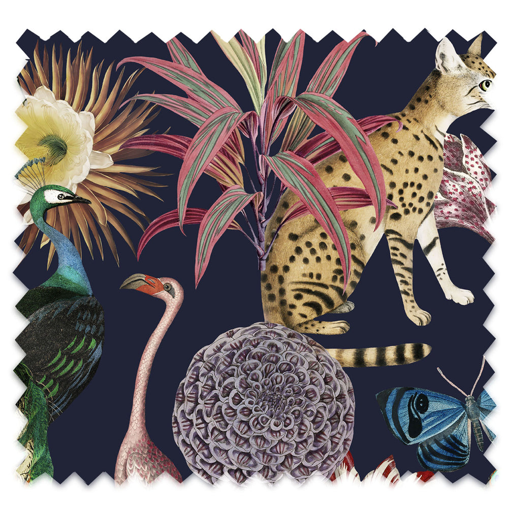 Akin to a magnificent work of art, enchanting Les Plumes depicts a gloriously tropical utopia. A large-scale, maximalist print, its menagerie of peacocks, flamingos, butterflies, and sphinx meander amongst a riot of big, bold blooms. Prepare to be entranced.