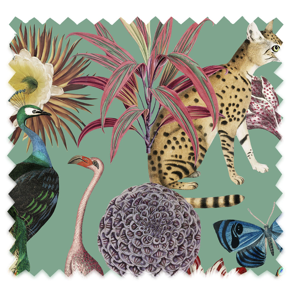 Akin to a magnificent work of art, enchanting Les Plumes depicts a gloriously tropical utopia. A large-scale, maximalist print, its menagerie of peacocks, flamingos, butterflies, and sphinx meander amongst a riot of big, bold blooms. Prepare to be entranced.