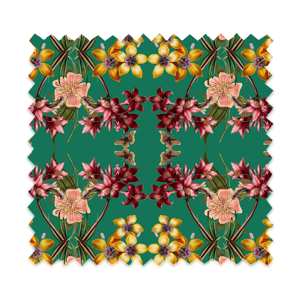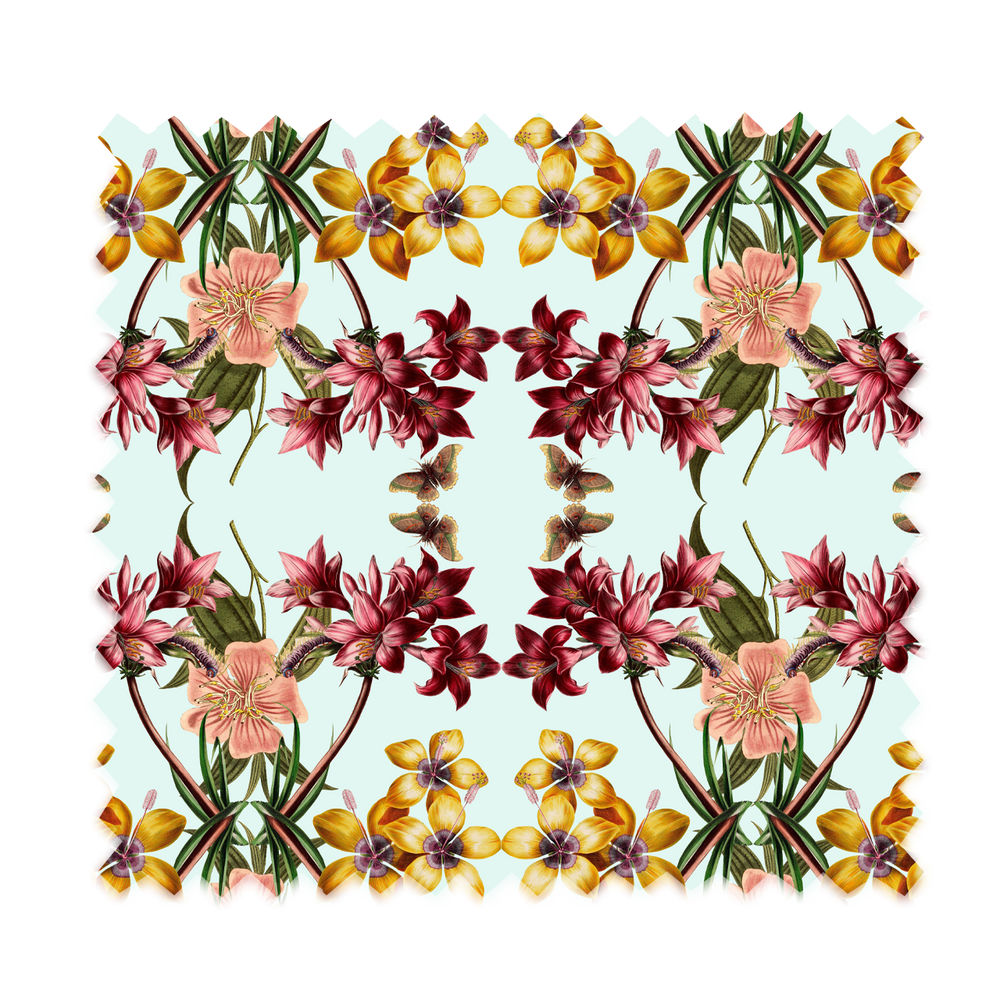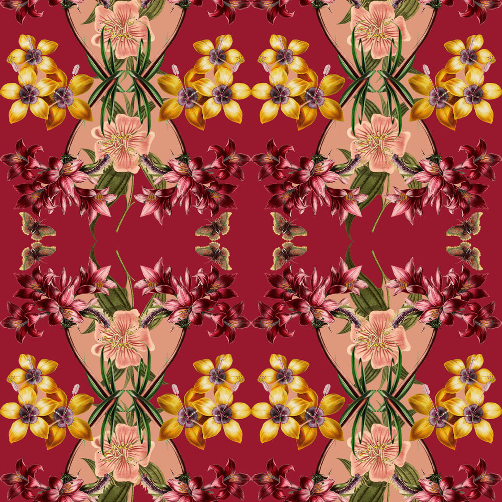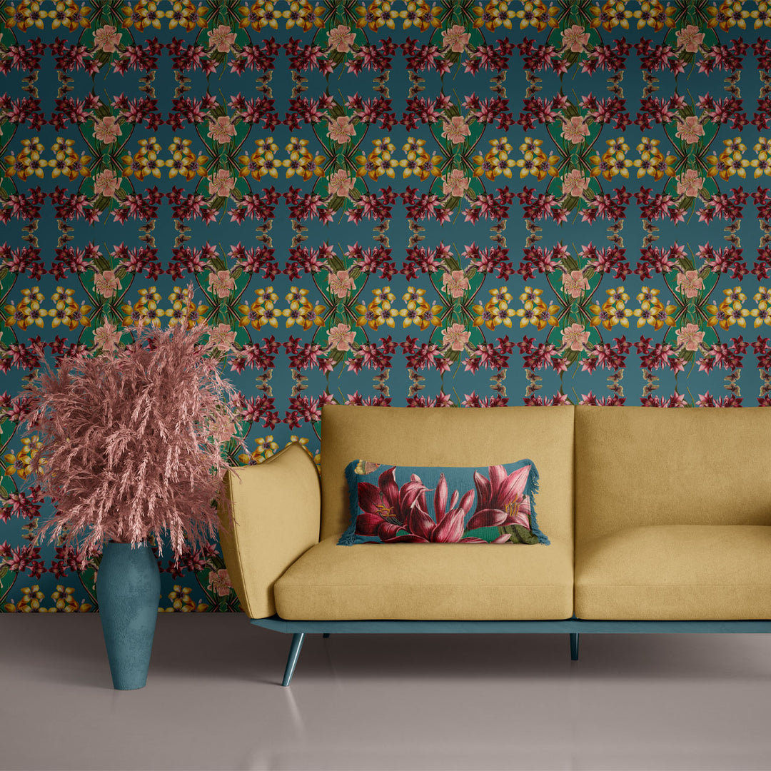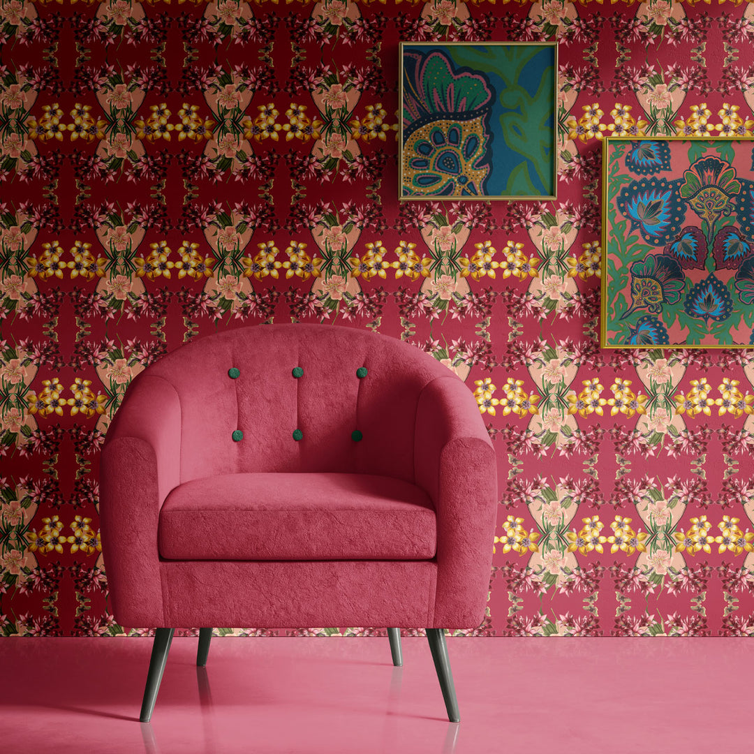 Our joyful Hampi design takes its name from the once-lavish Hindu city in southern India, where evocative ruins and ethereal landscapes evoke legends of idols and monkey gods. A fantastical floral feast, the design features an exotic kaleidoscope of yellow, blush, and burgundy blooms.