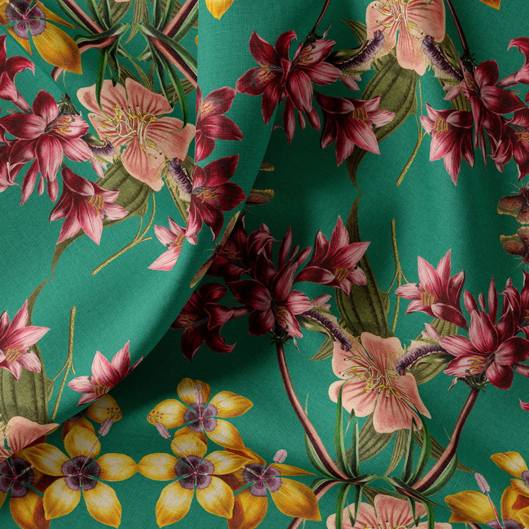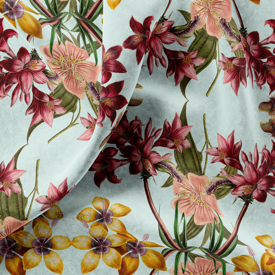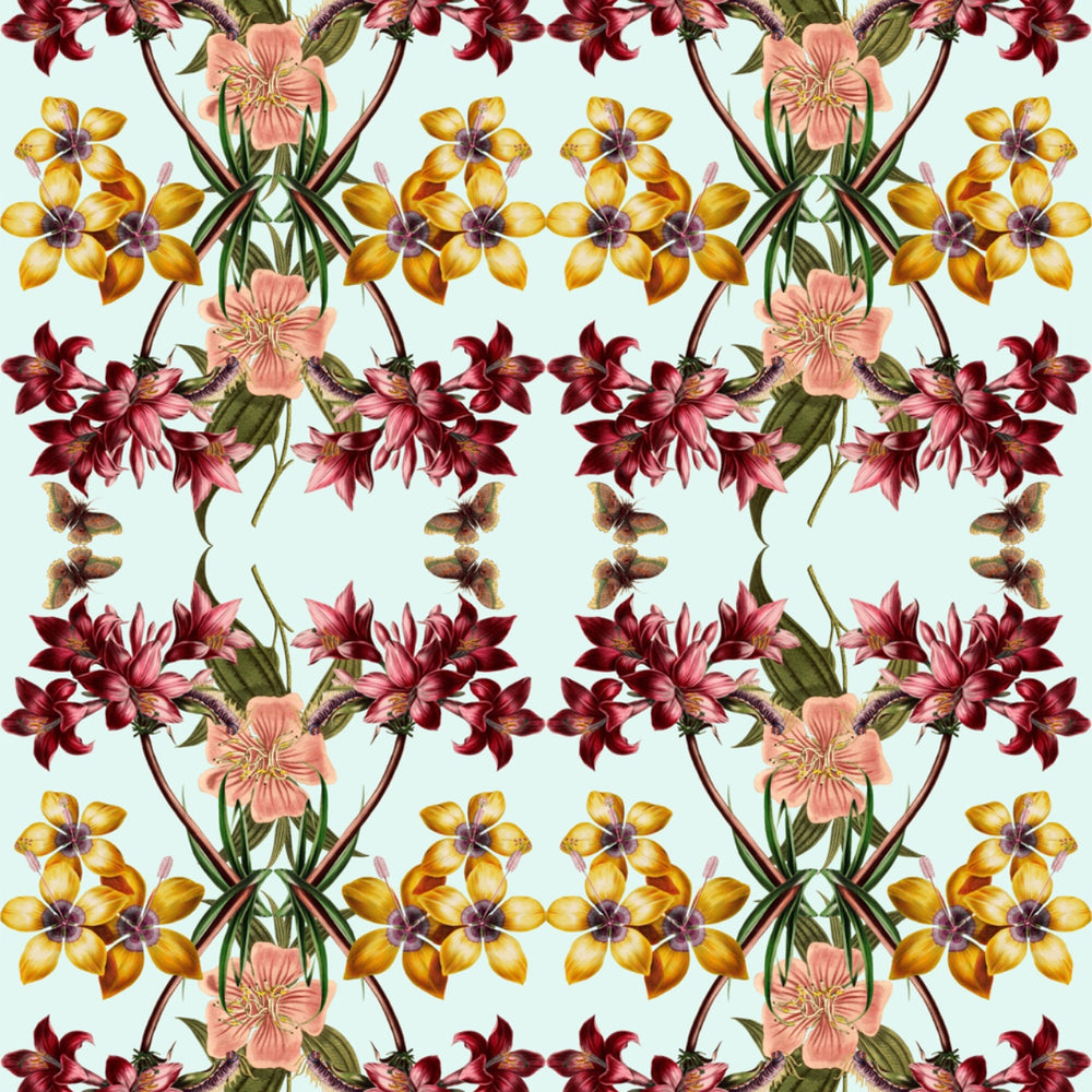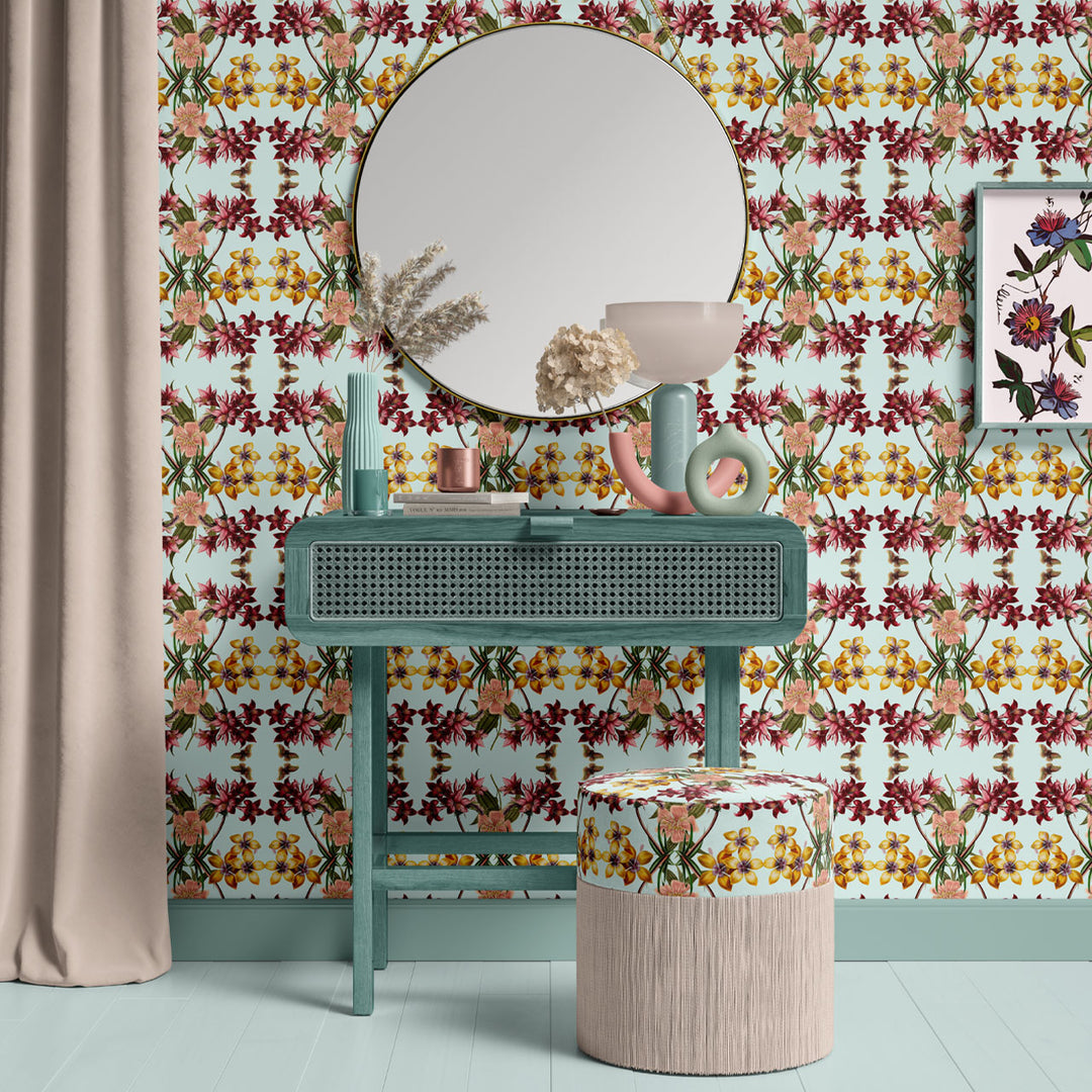 Our joyful Hampi design takes its name from the once-lavish Hindu city in southern India, where evocative ruins and ethereal landscapes evoke legends of idols and monkey gods. A fantastical floral feast, the design features an exotic kaleidoscope of yellow, blush, and burgundy blooms.