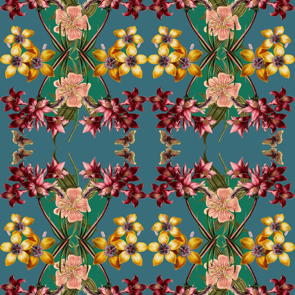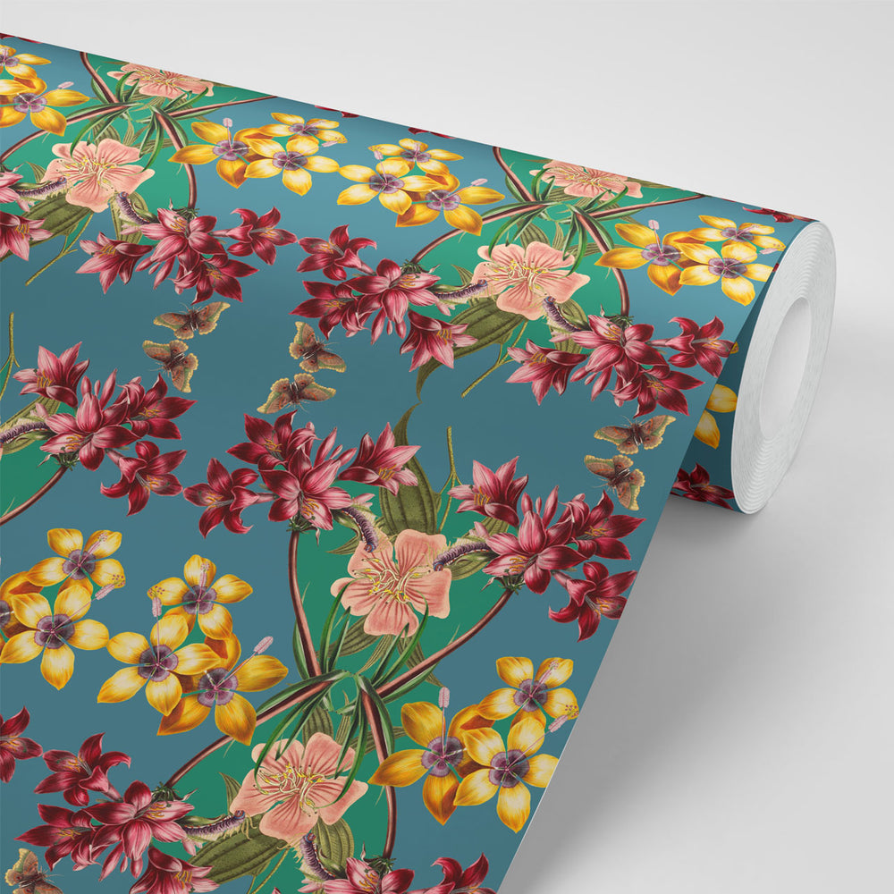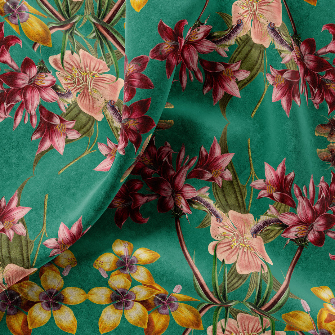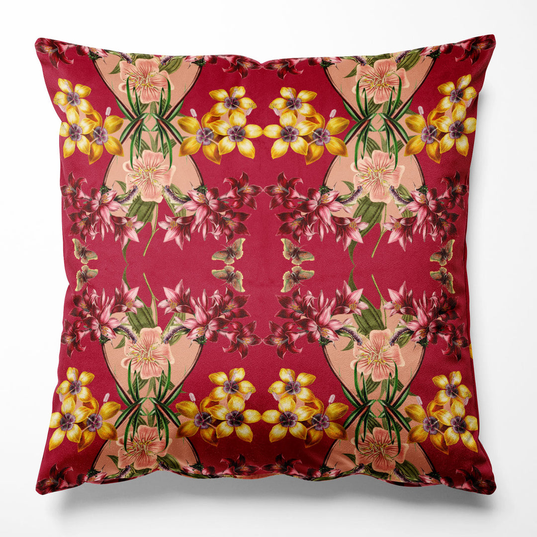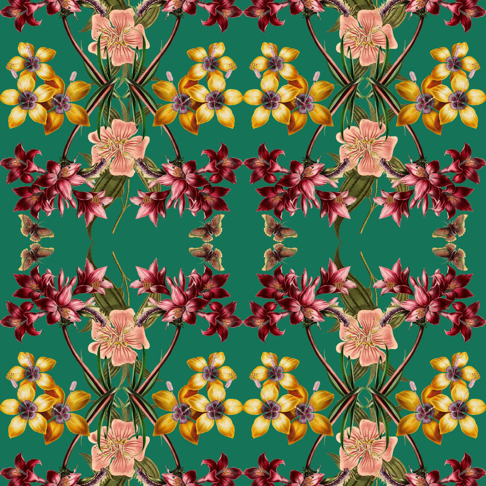 Our joyful Hampi design takes its name from the once-lavish Hindu city in southern India, where evocative ruins and ethereal landscapes evoke legends of idols and monkey gods. A fantastical floral feast, the design features an exotic kaleidoscope of yellow, blush, and burgundy blooms.